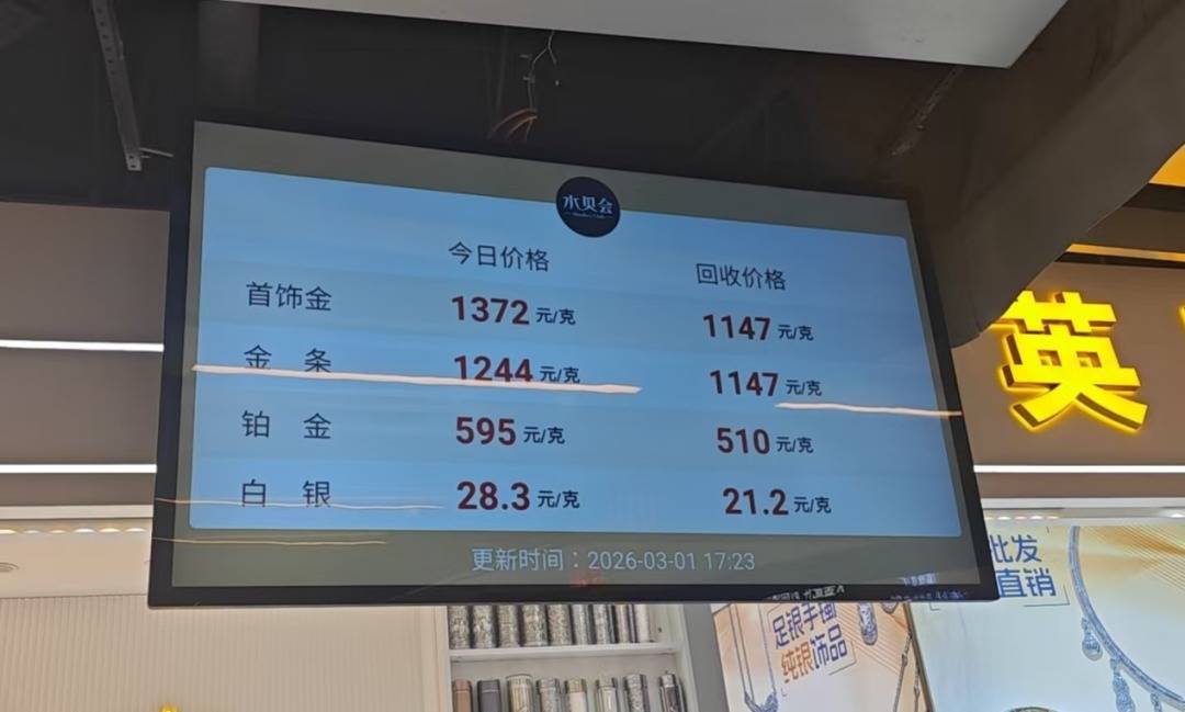当日,水贝实时交易大屏显示,水贝首饰金1372元/克,金条1244元/克。购买首饰金时,多家水贝商家也会给到消费者“不含税”的首饰金价,约等于金条价格,比公开报价每克约低百元。