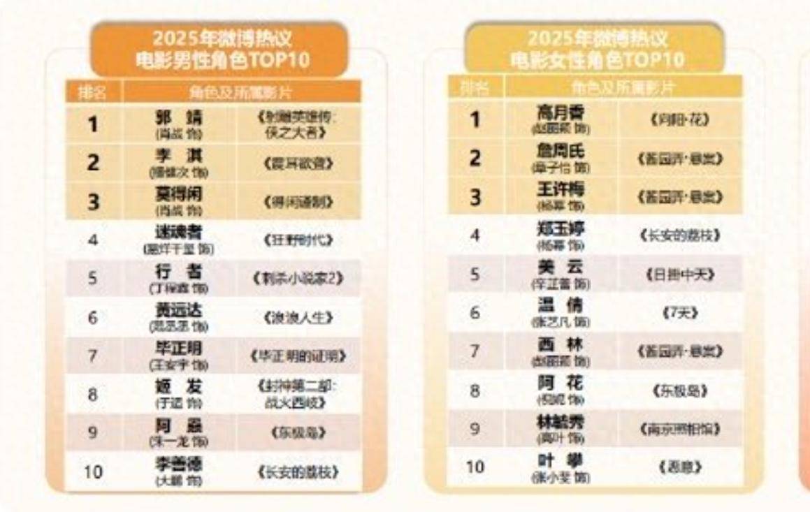 2025年热议男性角色TOP10和2025年热议电影女性角色TOP10。